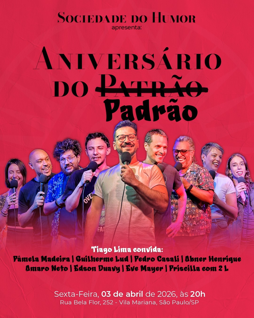 Nosso padrãozinho vai ficar (ainda) mais velho! E convidou amigos incríveis pra tornar essa comemoração muito mais legal! Elenco: Tiago Lima, Abner Henrique, Amaro Neto, Edson Duavy, Eve Mayer, Guilherme Lud, Pâmela Madeira, Pedro Casali e Priscilla com 2 L. Já garante seu ingresso (tá muito mais barato que comprar presente, ou rachar a conta com aquele amigo sem noção que pede o bar e a cozinha inteiros só porque vai dividir por igual). Quer dar um presente ainda mais legal pro nosso aniversariante? Segue ele no instagram: @tidiverte