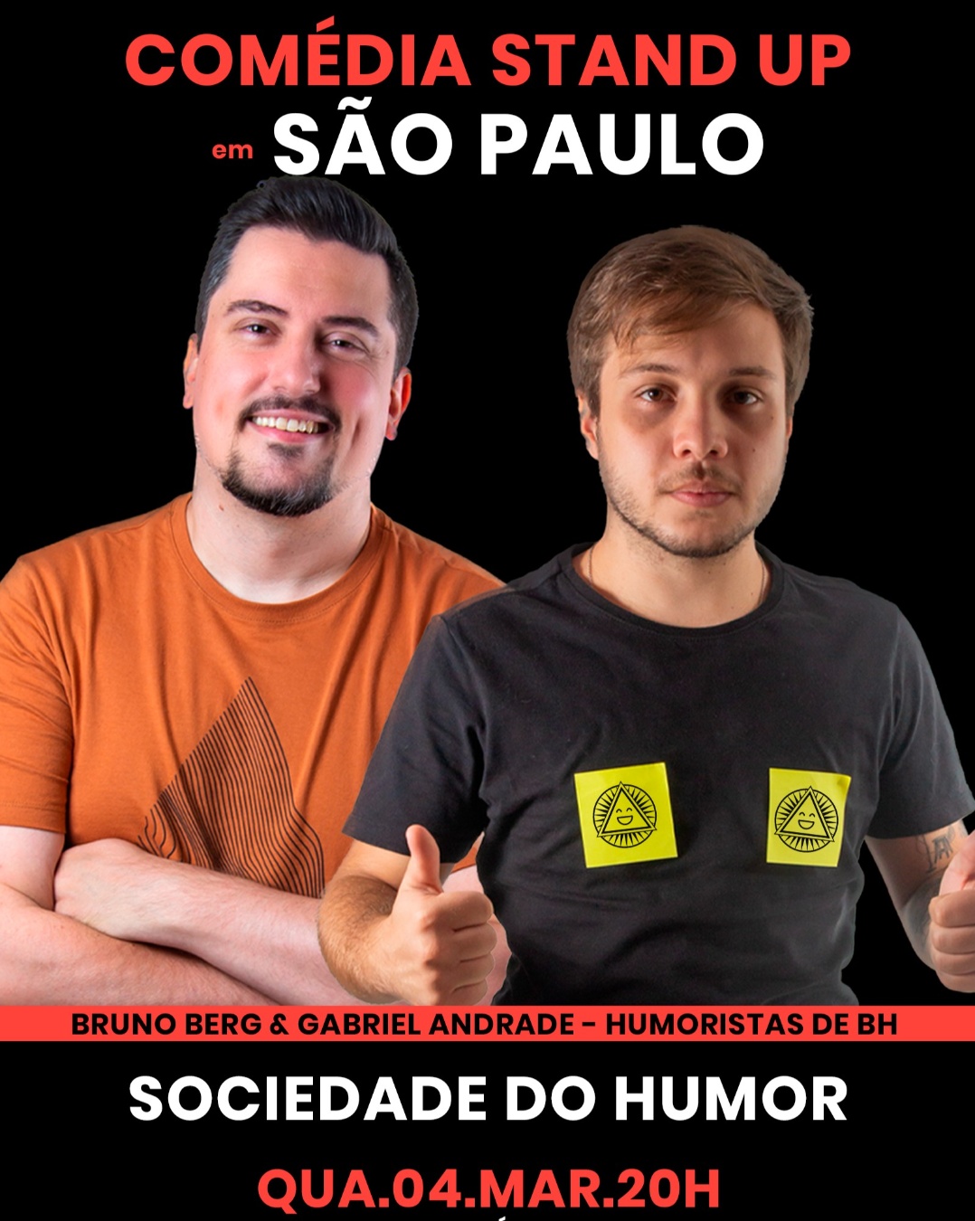 Show de comédia stand up em São Paulo com os humoristas Bruno Berg e Gabriel Andrade. Bruno Berg faz parte da Cia de humor Desculpa Qualquer Coisa, vencedor do Fight de Piadas do programa The Noite com Danilo Gentili e um dos pioneiros do stand up em Minas Gerais. Gabriel Andrade é um dos grandes talentos da nova geração de humoristas mineiros com diversos vídeos viralizados na internet e um estilo de humor muito característico com piadas curtas. Quarta-feira, 04 de março de 2026, às 20h, na Sociedade do Humor (Rua Bela Flor, 252 - Vila Mariana), a casa mais misteriosa do humor paulista. Abertura da casa: 19h00 (chegue cedo para aproveitar nossas empanadas, porções, sobremesas, cervejas e drinks em lata sem metanol) Showtime: 20h (lugares escolhidos por ordem de chegada) Tolerância máxima: 15 minutos (após esse tempo fechamos o portão e não é permitida a entrada) Cardápio, localização, ingressos e mais informações clicando aqui. Compre seu ingresso antecipado com desconto para garantir sua participação (a venda de ingressos na hora está sujeita a lotação e não possui desconto).