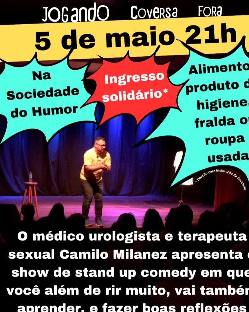 Ingresso solidário: Só retirar o ingresso e, no dia do show, levar 1 kg de alimento, ou fralda, ou produto de higiene, ou roupa, que serão doadas para instituição de caridade. Depois de QUANDO O OVO POCA / QUANDO O OVO SOCA o Dr. Camilo Milanez (médico urologista) lança seu novo show: JOGANDO COVERSA FORA! Chame seu par, seus amigos, sua família, e venha assistir um show de stand up comedy ao mesmo tempo muito engraçado educativo!! Terça-feira 05 de maio de 2026, às 21h, na Sociedade do Humor (Rua Bela Flor, 252 - Vila Mariana), a casa mais misteriosa do humor paulista. Abertura da casa: 20h00 (chegue cedo para aproveitar nossas empanadas, porções, sobremesas, cervejas e drinks em lata). Showtime: 21h (lugares escolhidos por ordem de chegada). Tolerância máxima: 15 minutos (após esse tempo fechamos o portão e não é permitida a entrada). Cardápio, localização, ingressos e mais informações no instagram @sociedadedohumor.