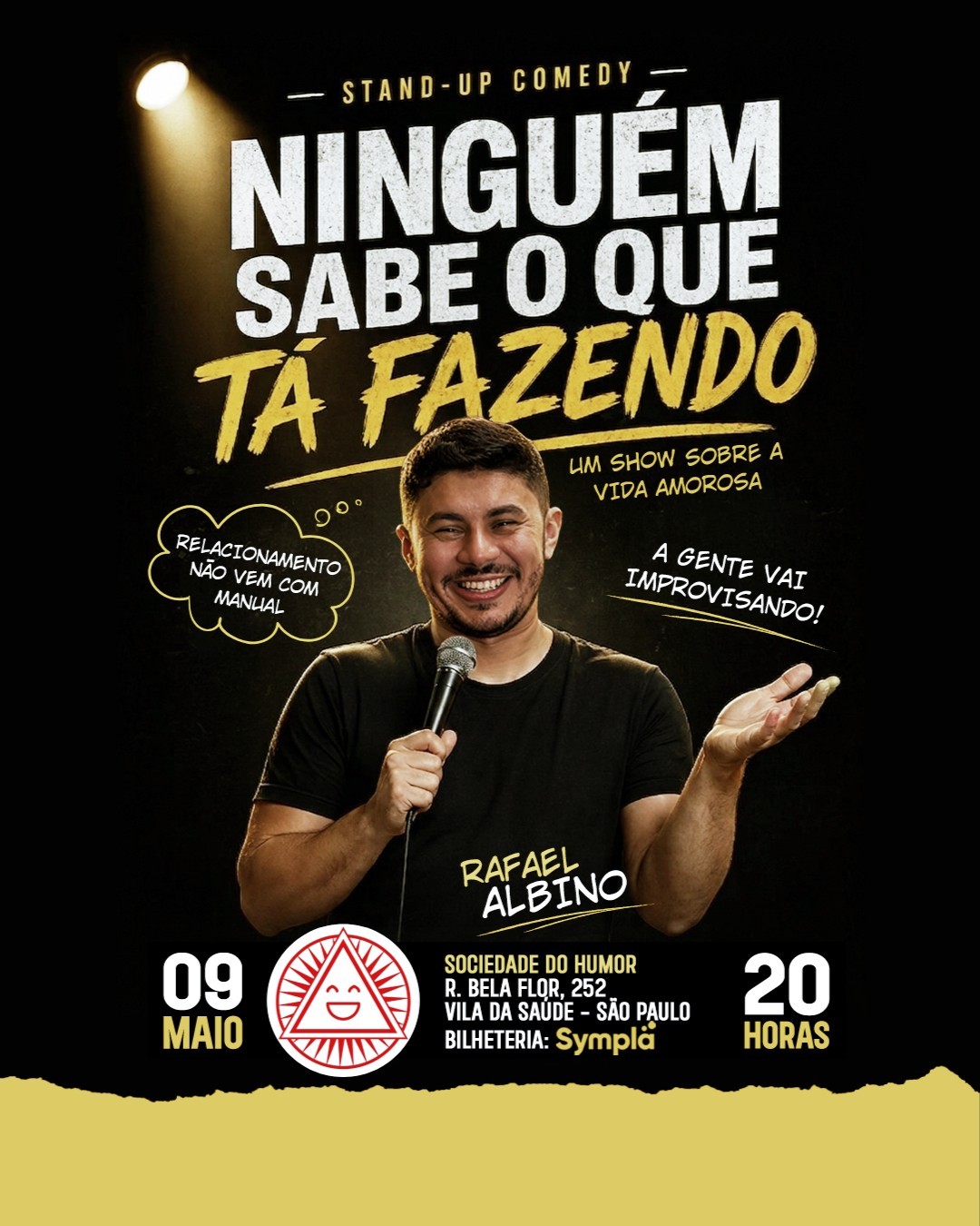 Desde Adão e Eva a vida amorosa é uma das coisas mais difíceis da vida e esse problema tá aí até hoje, pra gente resolver. Casado não sabe como manter. Solteiro não sabe como começar. Quem namora não sabe se tá fazendo certo. E quem terminou ainda tenta entender onde tudo deu errado. Em seu novo show de comédia, Rafael Albino mostra que Ninguém Sabe o Que Tá Fazendo quando se trata de relacionamentos. Neste espetáculo, Rafael te ajuda a entender as peças e colocá-las em seu devido lugar. Com seu humor cativante e envolvente, Albino te convida a rir e a se emocionar com um show de comédia que fala mais da gente do que a gente imagina. 📍Sociedade do Humor: Rua Bela Flor, 252 — Vila Mariana 📅09 de maio (sábado) 🍻Abertura da casa: 17h (chegue cedo para aproveitar o bar e o cardápio) 🕑Showtime: 20h ⌛Tolerância: 15 minutos após o início (após esse período, não é permitida a entrada). 🎟️Lugares limitados. Garanta antecipado com desconto. Sujeito à lotação. 🥤Cardápio, como chegar e mais informações no instagram: @sociedadedohumor