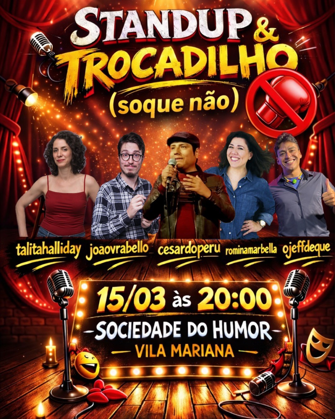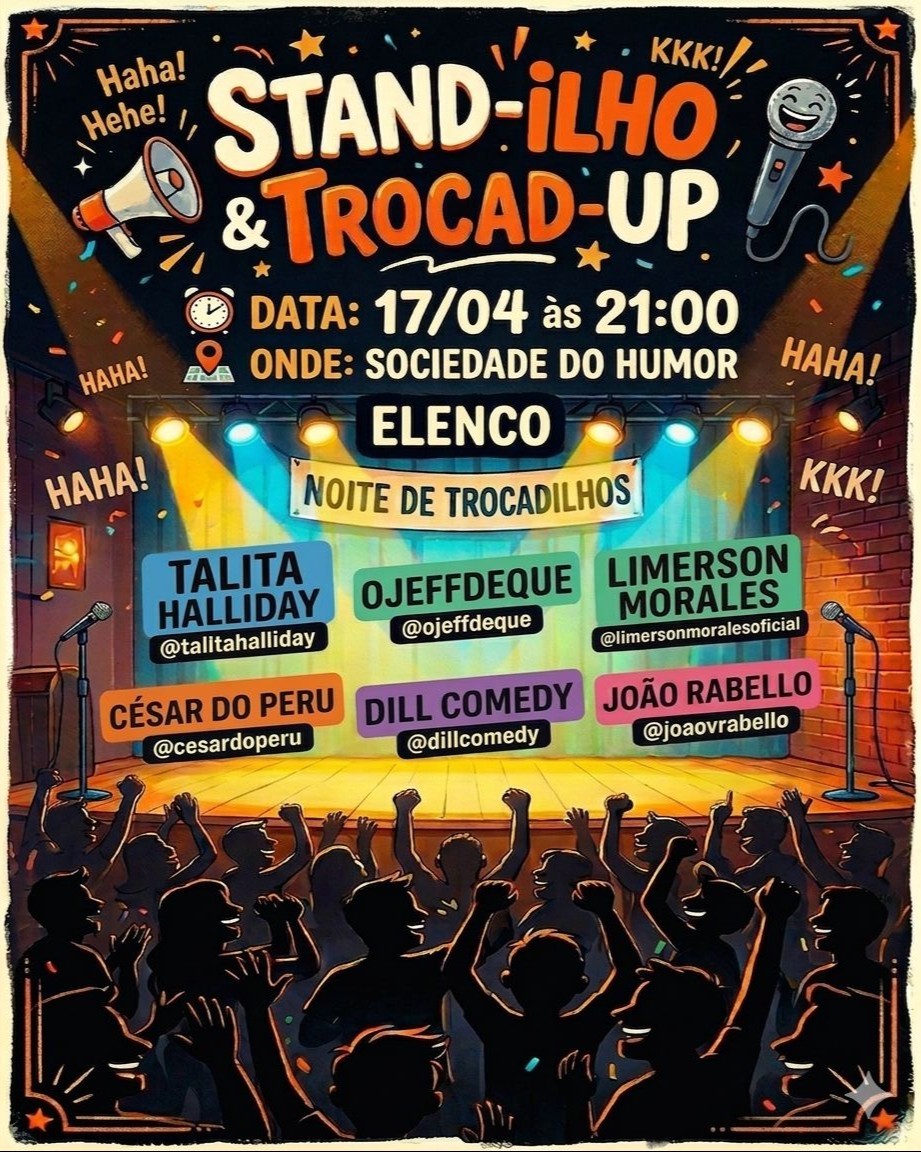 Uma noite dedicada ao humor que brinca com a língua portuguesa, torce palavras, cria duplos, triplos e até quádruplos sentidos, e prova que uma frase pode rir de si mesma, mesmo que o mesmo não se encontre no andar. Cinco comediantes com um parafuso e horário a menos, sobem ao palco com sets autorais onde o trocadilho não é detalhe, é protagonista digno de Oscar (do Basquete). Se você gosta de piadas inteligentes, inesperadas e daquele riso que vem meio culpado, essa noite é pra você. Prepare-se para ouvir frases que você nunca mais vai conseguir desouvir. Qualquer reclamação, entre em contato na desouvidoria. Domingo, 15 de março de 2026, às 20h, na Sociedade do Humor (Rua Bela Flor, 252 - Vila Mariana), a casa mais misteriosa do humor paulista. Abertura da casa: 17h00 (chegue cedo para aproveitar nossas empanadas, porções, sobremesas, cervejas e drinks em lata) Showtime: 20h (lugares escolhidos por ordem de chegada) Tolerância máxima: 15 minutos (após esse tempo fechamos o portão e não é permitida a entrada) Cardápio, localização, ingressos e mais informações clicando aqui. Compre seu ingresso antecipado com desconto para garantir sua participação (a venda de ingressos na hora está sujeita a lotação e não possui desconto).