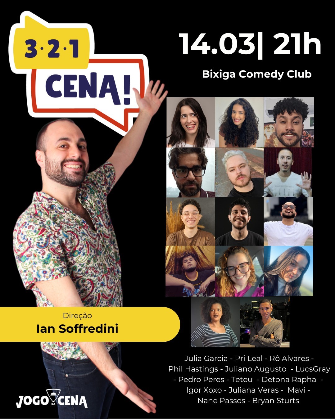 3, 2, 1...CENA! É uma comédia interativa onde cenas de humor são criadas na hora, sem nenhum ensaio, a partir de ideias, estímulos e temas sugeridos pela plateia presente a cada noite! Gargalhadas garantidas!