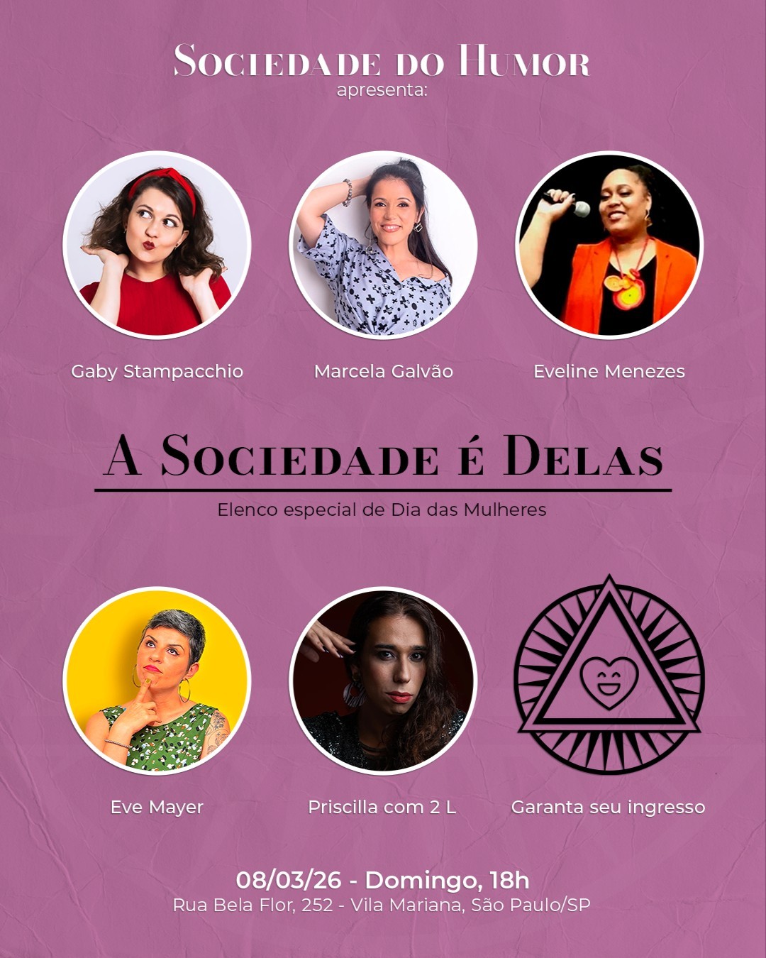 ELENCO ESPECIAL DE DIA DAS MULHERES: GABY STAMPACCHIO, MARCELA GALVÃO, EVELINE MENEZES, EVE MAYER E PRISCILLA COM 2 L. A Sociedade do Humor é o primeiro e único clube de comédia de São Paulo que oferece uma noite de comédia fixa semanal com elenco exclusivamente feminino desde a sua inauguração. Venha prestigiar esse show incrível e descobrir que tem muita mulher boa na comédia, só faltava palco e visibilidade (agora não falta mais). Diferente de outras noites de comédia feminina, A Sociedade é Delas não é limitada apenas à comediantes de Stand Up, mas também abrimos espaço para improviso, mágica, palhaçaria, drag, musical, personagem, esquetes, teatro, artes circenses e muito mais. Elenco secreto e rotativo, domingos, na Sociedade do Humor (Rua Bela Flor, 252 - Vila Mariana), a casa mais misteriosa do humor paulista. Chegue cedo para aproveitar nossas empanadas, porções, sobremesas, cervejas e drinks em lata sem metanol; Lugares escolhidos por ordem de chegada; Tolerância máxima: 15 minutos (após esse tempo fechamos o portão e não é permitida a entrada); Cardápio, localização, ingressos e mais informações no link da bio do nosso instagram: @sociedadedohumor Compre seu ingresso antecipado com desconto para garantir sua participação (a venda de ingressos na hora está sujeita a lotação e não possui desconto). Siga a gente no Instagram: @sociedadedohumor. (Não conta pra ninguém, mas talvez você consiga benefícios ao seguir ) --- Regras: Classificação indicativa: 18 anos, menores de idade podem entrar acompanhados de um responsável (não oferecemos serviço de aluguel de responsáveis na porta). Capacidade: 60 lugares, por ordem de chegada (mas prefiram os lugares próximos ao palco - os comediantes são carentes). Tolerância de atraso: 15min após horário do Show (após esse tempo fechamos o portão e não é permitida a entrada). O cancelamento do ingresso deve ser feito até 24h antes do evento diretamente pelo Sympla (não reembolsamos não comparecimento). Por sermos um clube de comédia, com serviços de alimentação e bebidas, trabalhamos com couvert artístico (não sendo aplicável a lei da meia-entrada). Não temos serviço de valet, nem estacionamento e não temos convênio com os estacionamentos da região (sugerimos usar o transporte público). --- Sobre a Sociedade do Humor Pode ser que você já tenha visto nosso logo por aí, ou tenha passado pela nossa casinha, e ficou se perguntando se era um culto, uma seita, uma sociedade secreta ou algo assim, né? Porém, só há motivos para curiosidade (não para medo, preocupação, ou preconceito), pois, na verdade, nós somos um Clube de Comédia! (Ou seja, talvez meio que somos tudo isso também...) O único trabalho feito aqui é fazer você rir. O único pacto que temos é com a diversão. Ufa, né? Pode ser que você não saiba o que é um clube de comédia, ou talvez nunca tenha ido a um... Sabe aqueles vídeos divertidos que vemos na internet? Então, aqui você vai ver isso acontecendo ao vivo, enquanto degusta nossas deliciosas comidas e bebidas, além de desfrutar de um espaço pensado no seu conforto, com uma programação diversa e para todos. Em nosso espaço oferecemos shows de stand up, improviso, mágica, palhaçaria, drag, musical, personagem, esquetes, teatro, artes circenses e muito mais. Além disso, aqui na Sociedade do Humor, você também pode fazer e participar de cursos, palestras, workshops, treinos, ensaios, eventos, festas, fotografias e gravações audiovisuais. No nosso perfil do Instagram (@sociedadedohumor) você encontra mais informações, além de conferir nossa programação e ingressos. Veja fotos, avaliações e mais informações no link da bio do nosso instagram: @sociedadedohumor --- Estamos só começando, então já sabe: apoie, compartilhe e não seja cuzão.