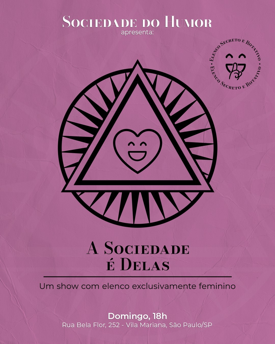 A Sociedade do Humor é o primeiro e único clube de comédia de São Paulo que oferece uma noite de comédia fixa semanal com elenco exclusivamente feminino desde a sua inauguração. Venha prestigiar esse show incrível e descobrir que tem muita mulher boa na comédia, só faltava palco e visibilidade (agora não falta mais). Diferente de outras noites de comédia feminina, A Sociedade é Delas não é limitada apenas à comediantes de Stand Up, mas também abrimos espaço para improviso, mágica, palhaçaria, drag, musical, personagem, esquetes, teatro, artes circenses e muito mais. Elenco secreto e rotativo, domingo, às 18h, na Sociedade do Humor (Rua Bela Flor, 252 - Vila Mariana), a casa mais misteriosa do humor paulista. Chegue cedo para aproveitar nossas empanadas, porções, sobremesas, cervejas e drinks em lata sem metanol; Lugares escolhidos por ordem de chegada; Tolerância máxima: 15 minutos (após esse tempo fechamos o portão e não é permitida a entrada); Cardápio, localização, ingressos e mais informações no link da bio do nosso instagram: @sociedadedohumor Compre seu ingresso antecipado com desconto para garantir sua participação (a venda de ingressos na hora está sujeita a lotação e não possui desconto). Siga a gente no Instagram: @sociedadedohumor. (Não conta pra ninguém, mas talvez você consiga benefícios ao seguir ) --- Regras: Classificação indicativa: 18 anos, menores de idade podem entrar acompanhados de um responsável (não oferecemos serviço de aluguel de responsáveis na porta). Capacidade: 60 lugares, por ordem de chegada (mas prefiram os lugares próximos ao palco - os comediantes são carentes). Tolerância de atraso: 15min após horário do Show (após esse tempo fechamos o portão e não é permitida a entrada). O cancelamento do ingresso deve ser feito até 24h antes do evento diretamente pelo Sympla (não reembolsamos não comparecimento). Por sermos um clube de comédia, com serviços de alimentação e bebidas, trabalhamos com couvert artístico (não sendo aplicável a lei da meia-entrada). Não temos serviço de valet, nem estacionamento e não temos convênio com os estacionamentos da região (sugerimos usar o transporte público). --- Sobre a Sociedade do Humor Pode ser que você já tenha visto nosso logo por aí, ou tenha passado pela nossa casinha, e ficou se perguntando se era um culto, uma seita, uma sociedade secreta ou algo assim, né? Porém, só há motivos para curiosidade (não para medo, preocupação, ou preconceito), pois, na verdade, nós somos um Clube de Comédia! (Ou seja, talvez meio que somos tudo isso também...) O único trabalho feito aqui é fazer você rir. O único pacto que temos é com a diversão. Ufa, né? Pode ser que você não saiba o que é um clube de comédia, ou talvez nunca tenha ido a um... Sabe aqueles vídeos divertidos que vemos na internet? Então, aqui você vai ver isso acontecendo ao vivo, enquanto degusta nossas deliciosas comidas e bebidas, além de desfrutar de um espaço pensado no seu conforto, com uma programação diversa e para todos. Em nosso espaço oferecemos shows de stand up, improviso, mágica, palhaçaria, drag, musical, personagem, esquetes, teatro, artes circenses e muito mais. Além disso, aqui na Sociedade do Humor, você também pode fazer e participar de cursos, palestras, workshops, treinos, ensaios, eventos, festas, fotografias e gravações audiovisuais. No nosso perfil do Instagram (@sociedadedohumor) você encontra mais informações, além de conferir nossa programação e ingressos. Veja fotos, avaliações e mais informações no link da bio do nosso instagram: @sociedadedohumor --- Estamos só começando, então já sabe: apoie, compartilhe e não seja cuzão.