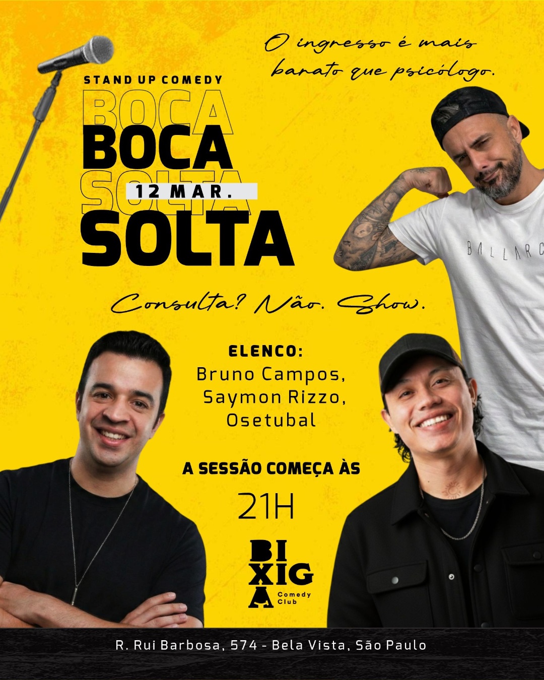 Boca Solta é uma noite que nasceu em Floripa por Saymon Rizzo, nordestino raiz perdido no Sul e agora em São Paulo. Uma noite de comédia sem filtros, com risadas intensas e histórias soltas que vão te pegar de surpresa.