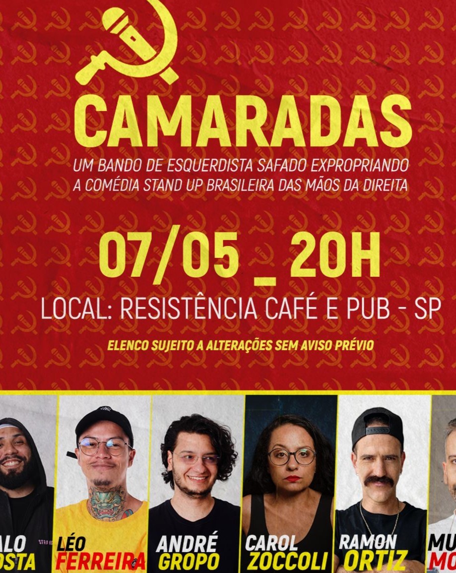 Expropriando a comédia das mãos da direita e fazendo do riso um ato político. Os Camaradas chegam ao palco do Resistência Pub com piadas afiadas pra te fazer gargalhar e lutar contra o sistema. No elenco: Carol Zoccoli Ramon Ortiz Bruno Costoli Léo Ferreira André Gropo Murilo Moraes ìtalo Costa