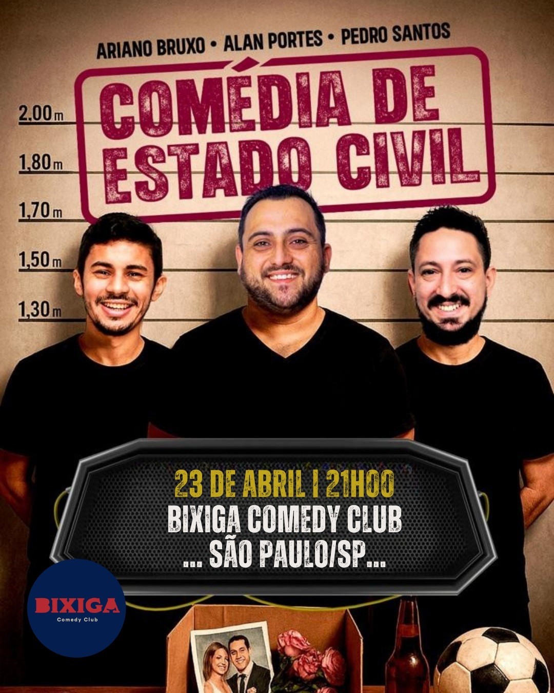 Prepare-se para rir das desventuras do matrimônio! O show "Comédia de Estado Civil" chega ao Bixiga Comedy Club, trazendo um olhar hilário sobre relacionamentos, divórcios e a vida a dois. Com um elenco de peso — Ariano Bruxo, Alan Portes e Pedro Santos — a noite promete ser o "crime perfeito" do humor em São Paulo.