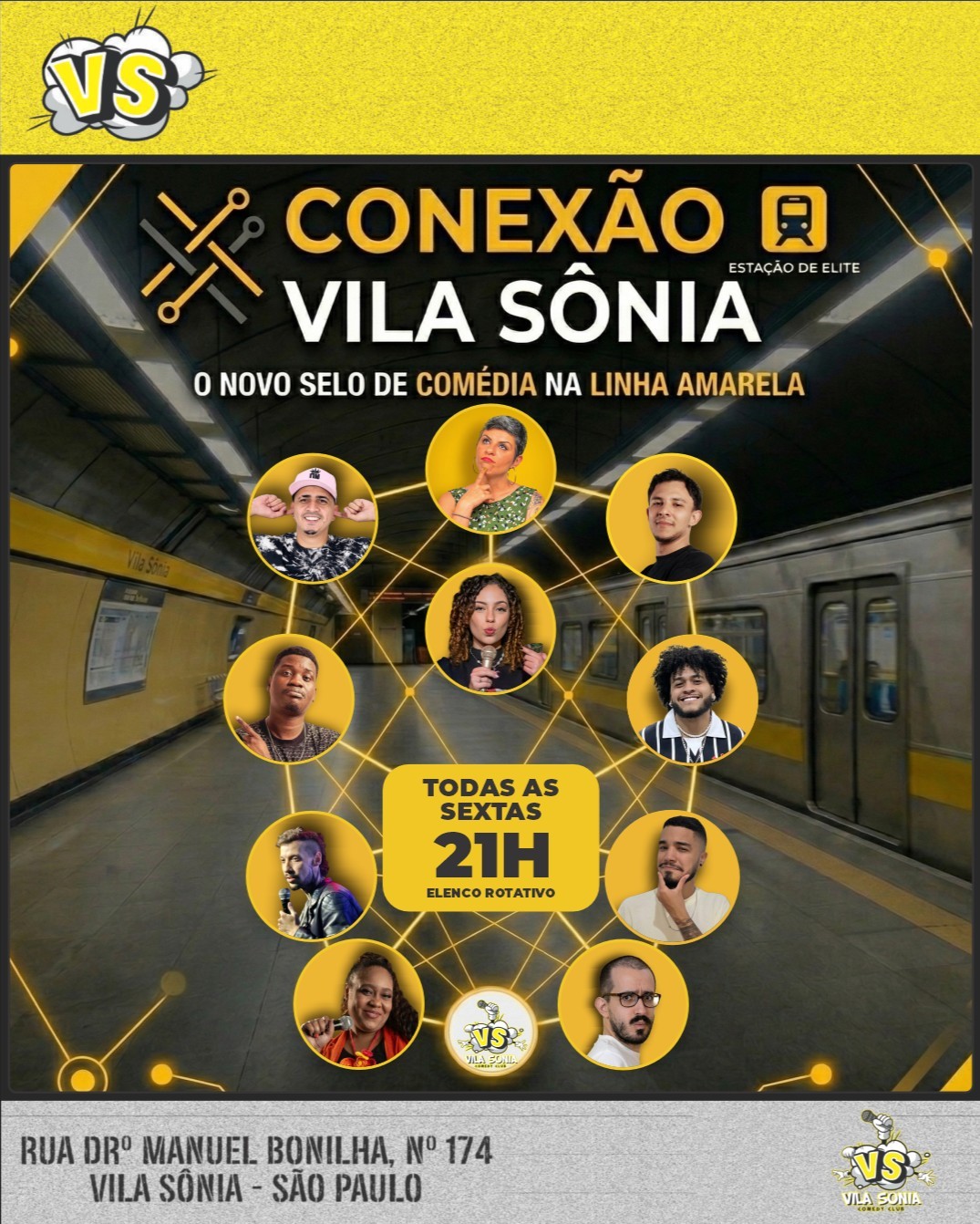 Conexão Vila Sônia – Sua Próxima Parada é Aqui! 🚇 Toda sexta-feira, às 21h, o Vila Sônia Comedy Club vira o ponto de encontro oficial de quem quer fechar a semana com chave de ouro. No show Conexão Vila Sônia, a gente conecta você diretamente com o que há de melhor no stand-up comedy. E a viagem fica completa no nosso Bar e Cozinha! 🍹🥨 Enquanto os comediantes dominam o palco, nossa equipe domina o sabor. Temos um cardápio variado de drinks e porções, mas o aviso na plataforma é obrigatório: você não pode ir embora sem provar a melhor coxinha de SP! Crocante por fora, suculenta por dentro e o acompanhamento perfeito para sua noite. Nosso elenco rotativo é uma verdadeira seleção de elite. Prepare-se para rir com: Abner Henrique Eve Mayer Eveline Menezes Pablo Calais Godoy Fernandes Helder Jantar Quel Dias Thiago Tomazelli Douglas Zoio Rafa Pinto (Consulte o elenco da semana) Não perca o horário, garanta seu lugar no vagão, prepare o apetite e venha, desembarque aqui com a gente!
