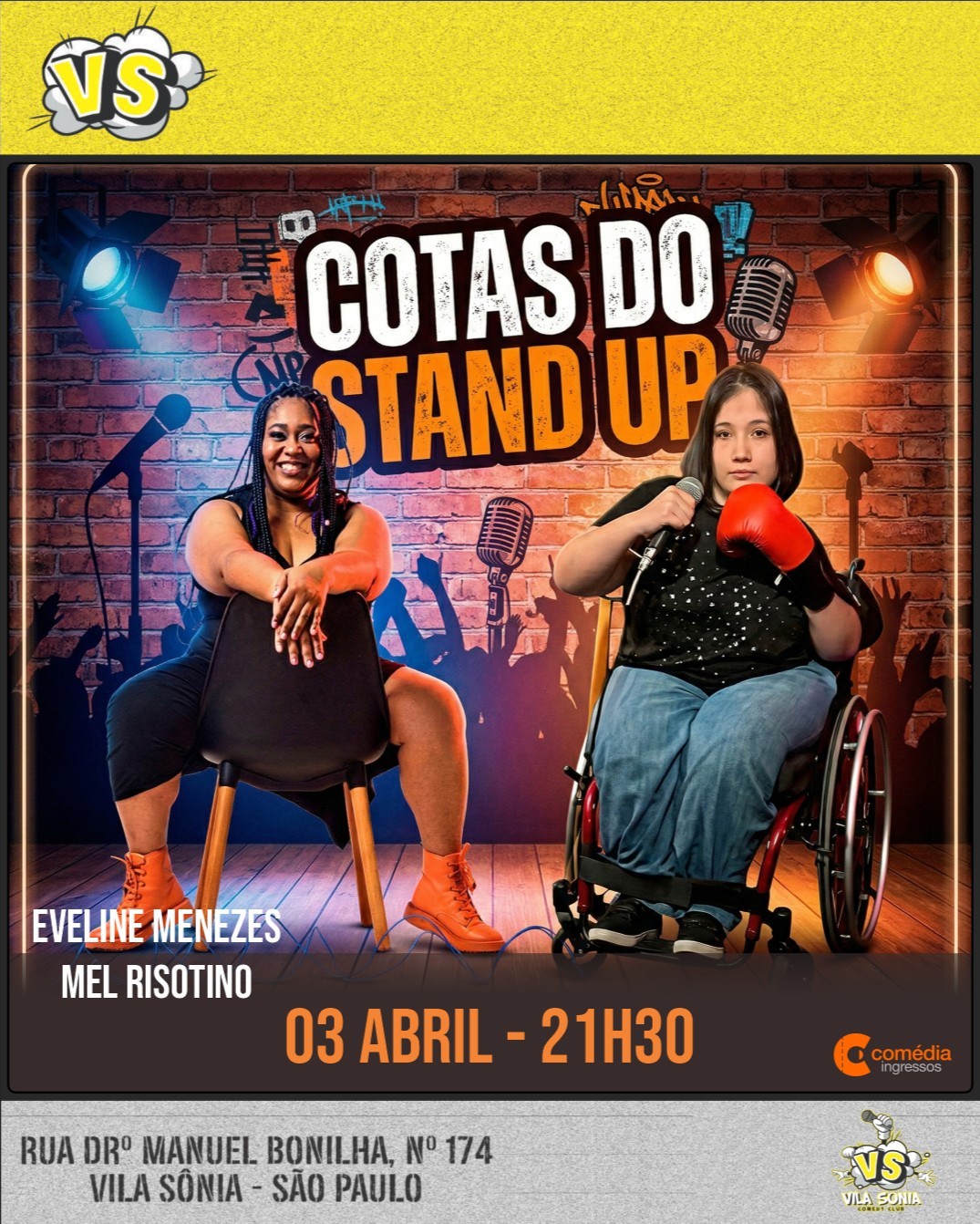 🎤 Cotas do Stand Up: Eveline Menezes & Mel Risotino Representatividade e risada garantida no palco do Vila Sônia! Eveline Menezes e Mel Risotino unem forças no show "Cotas do Stand Up", onde transformam o cotidiano, o preconceito e as situações absurdas da vida em piadas afiadas. Com estilos diferentes, mas uma química única, elas mostram que o lugar da mulher preta na comédia é onde ela quiser — de preferência, fazendo todo mundo chorar de rir. Um show que subverte as expectativas e prova que o humor é a melhor ferramenta para falar de tudo (e de todos). 📅 Informações do Show: Data: 03 de Abril Horário: 21h30 Local: Vila Sônia Comedy Club