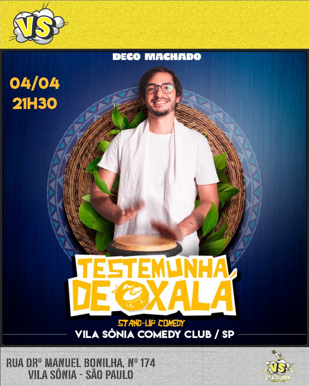 🎭 Deco Machado em: Testemunha de Oxalá Prepare-se para um espetáculo mais potente que despacho na encruzilhada às 3h33 da manhã! Deco Machado, veterano com quase uma década de vivência no terreiro, traz ao palco do Vila Sônia Comedy Club uma mistura única de fé, música e histórias hilárias sobre o cotidiano religioso. Seja você macumbeiro nato ou apenas um curioso, o show é diversão garantida para todos que querem entender (e rir) das curiosidades da Umbanda sob o olhar afiado de quem entende do assunto. Traga seu Exu, convoque seus irmãos de fé e venha descobrir por que esse show é tão bom que nem filha de Iemanjá precisa inventar história para te convencer! Informações do Show: 📅 Data: 04 de Abril (Sábado) 🕘 Horário: 21h30 (Abertura da casa às 19h) 📍 Local: Vila Sônia Comedy Club (Rua Dr. Manuel Bonilha, 174) 🔞 Classificação: 16 anos