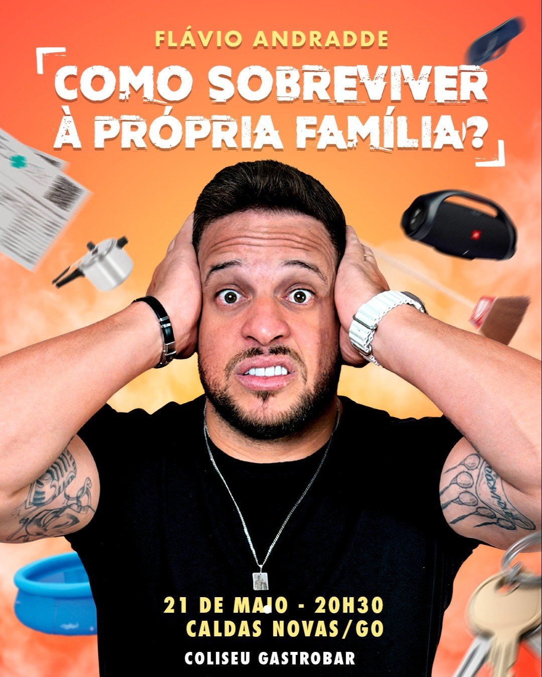 No novo show “Como Sobreviver à Própria Família?”, Flávio Andradde transforma as situações cotidianas vividas em família e recria os encontros clássicos que todo mundo já viveu, reuniões de domingo, festas comemorativas, com aqueles personagens que parecem ter saído de uma série de tv, e que toda família tem. Com sua experiência como ator, ele dá vida a avós, tias, mães, pais e parentes icônicos, costurando humor afiado, afeto e caos na medida certa. “Como Sobreviver à Própria Família?” é mais do que um show de comédia — é um convite para rir das relações que nos formam, nos enlouquecem e, mesmo assim, continuam sendo nosso porto seguro. Um espetáculo para quem já saiu da casa da avó achando que precisava de terapia... mas acabou levando uma ótima história pra contar. Vamos sobreviver às nossas famílias juntos?