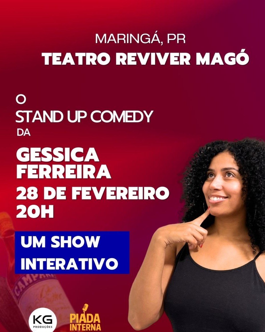 Gessica Ferreira é uma humorista brasileira que tem conquistado espaço no cenário do stand-up comedy com seu talento e carisma. Com um estilo único, Gessica aborda temas do cotidiano com uma perspectiva divertida e perspicaz, conquistando risadas por onde passa. Sua habilidade em conectar-se com o público e transformar situações simples em momentos hilários é uma de suas marcas registradas. Além dos palcos, Gessica também tem se destacado nas redes sociais, onde compartilha vídeos engraçados e interage com seus seguidores, ampliando ainda mais seu alcance e popularidade. Conheça mais sobre a artista em @gessicaferreira Siga @piadainternalondrina e fique por dentro dos principais shows de Stand Up em Londrina e Maringá! Local: Teatro Reviver Magó Praça Todos os Santos, s/n Maringá, PR