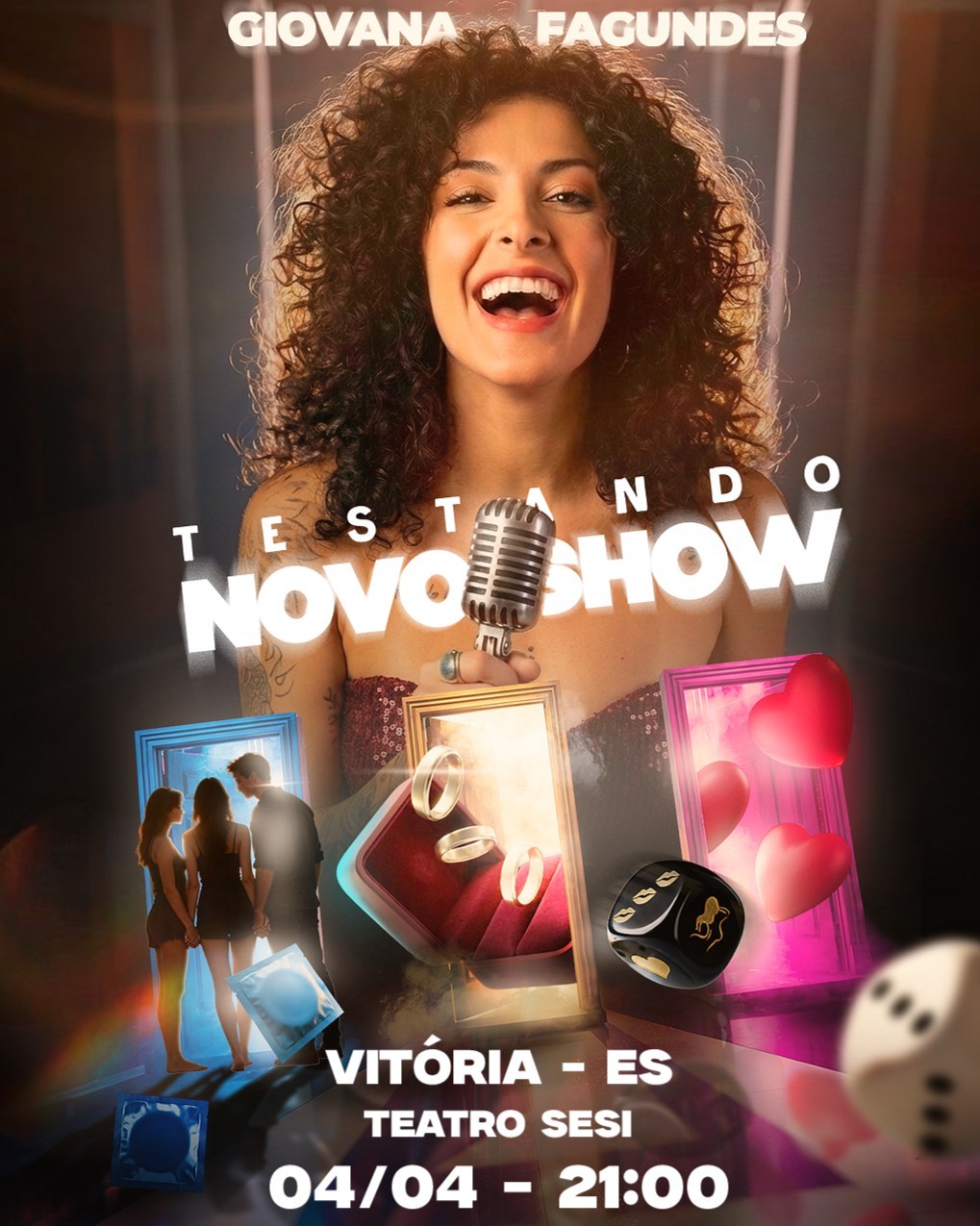 Abertura dos portões as 20h30 Show as 21h Giovana Fagundes ao vivo – Stand-Up Comedy A comediante Giovana Fagundes chega com seu novo show de stand-up para uma noite de humor afiado, inteligente e absurdamente identificável. Conhecida pelo olhar ácido e contemporâneo sobre comportamento, relações, autoestima e as contradições da vida adulta, Giovana transforma situações do cotidiano em piadas que arrancam risadas e reflexões na mesma medida. Com presença marcante e texto autoral forte, ela conquista o público ao falar sem filtro sobre inseguranças, expectativas sociais, padrões e as pequenas neuroses que todo mundo finge não ter. O espetáculo é dinâmico, atual e conversa diretamente com quem já tentou “dar conta de tudo” — e falhou com estilo. Entre confissões, ironias e observações certeiras, Giovana conduz o público por uma experiência divertida e cheia de identificação. Se você gosta de humor inteligente, direto e com personalidade, esse show é para você.