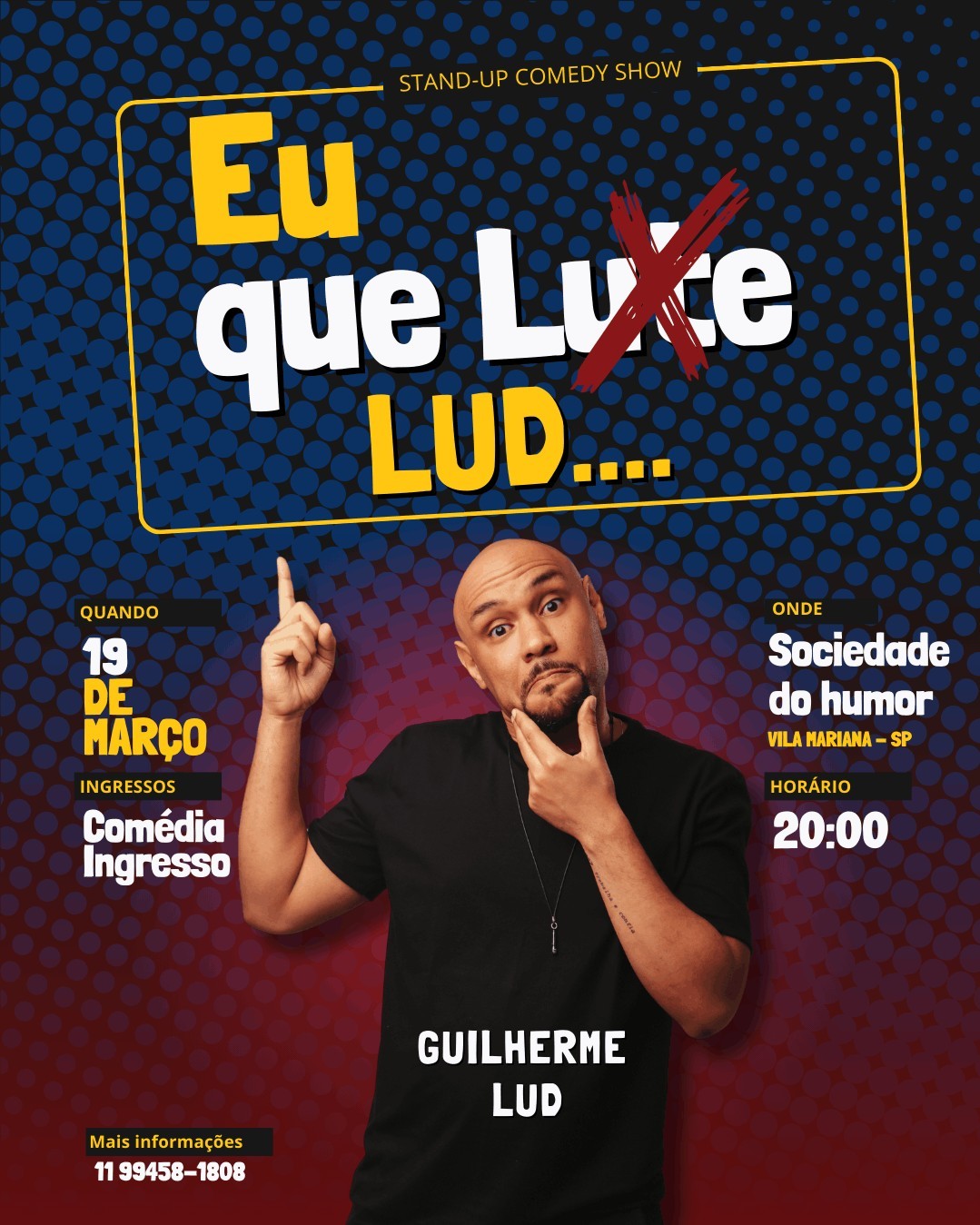 A vida te deu limões? Guilherme Lud fez stand-up. Depois de 7 anos nos palcos do Espírito Santo, Guilherme Lud apresenta "Eu que Lud", seu primeiro show solo de stand-up comedy. O nome não é à toa: é um trocadilho com a famosa expressão "eu que lute" - frase que resume perfeitamente a trajetória de alguém que transformou cada perrengue, cada situação constrangedora e cada "só acontece comigo" em material de risada. Do que se trata? São 60 minutos de humor inteligente e leve, onde Guilherme compartilha histórias reais da sua vida com aquele toque de autodepreciação que faz a gente rir e pensar "caramba, eu também já passei por isso". Desde criança ele avisou para a mãe que queria ser palhaço - ela não curtiu muito a ideia na época, mas hoje ele prova que estava certo (sobre fazer rir, não sobre a carreira de circo). O que esperar? Humor observacional e storytelling envolvente Situações inusitadas que só acontecem na vida real Um comediante que sabe rir de si mesmo e te convida para rir junto Quem é Guilherme Lud? Autodenominado "o melhor comediante capixaba da nova geração" (critério: os outros não estarão lá para desmentir), Guilherme construiu sua carreira nos palcos do stand-up capixaba ao longo de 7 anos. "Eu que Lud" marca sua estreia como headliner em show solo, provando que às vezes a melhor vingança contra as dificuldades da vida é simplesmente subir no palco e contar tudo. Por que assistir? Porque todo mundo precisa de uma noite para rir das próprias desgraças através das desgraças alheias. Porque humor de qualidade não precisa ser apelativo. E porque você merece descobrir que não está sozinho nas situações absurdas que a vida te coloca. Garanta seu ingresso e venha descobrir por que Guilherme insiste que "ele que lud" - e por que você vai sair agradecendo por isso. Quinta-feira, 19 de março de 2026, às 20h, na Sociedade do Humor (Rua Bela Flor, 252 - Vila Mariana), a casa mais misteriosa do humor paulista. Abertura da casa: 19h00 (chegue cedo para aproveitar nossas empanadas, porções, sobremesas, cervejas e drinks em lata sem metanol) Showtime: 20h (lugares escolhidos por ordem de chegada) Tolerância máxima: 15 minutos (após esse tempo fechamos o portão e não é permitida a entrada) Cardápio, localização, ingressos e mais informações no link da bio do nosso instagram: @sociedadedohumor Compre seu ingresso antecipado com desconto para garantir sua participação (a venda de ingressos na hora está sujeita a lotação e não possui desconto). Classificação Indicativa: Livre (conteúdo adequado para maiores de 14 anos). Duração: aproximadamente 60 minutos. ---- Sobre a Sociedade do Humor Pode ser que você já tenha visto nosso logo por aí, ou tenha passado pela nossa casinha, e ficou se perguntando se era um culto, uma seita, uma sociedade secreta ou algo assim, né? Porém, só há motivos para curiosidade (não para medo, preocupação, ou preconceito), pois, na verdade, nós somos um Clube de Comédia! (Ou seja, talvez meio que somos tudo isso também...) O único trabalho feito aqui é fazer você rir. O único pacto que temos é com a diversão. Ufa, né? Pode ser que você não saiba o que é um clube de comédia, ou talvez nunca tenha ido a um... Sabe aqueles vídeos divertidos que vemos na internet? Então, aqui você vai ver isso acontecendo ao vivo, enquanto degusta nossas deliciosas comidas e bebidas, além de desfrutar de um espaço pensado no seu conforto, com uma programação diversa e para todos. Em nosso espaço oferecemos shows de stand up, improviso, mágica, palhaçaria, drag, musical, personagem, esquetes, teatro, artes circenses e muito mais. Além disso, aqui na Sociedade do Humor, você também pode fazer e participar de cursos, palestras, workshops, treinos, ensaios, eventos, festas, fotografias e gravações audiovisuais. No nosso perfil do Instagram (@sociedadedohumor) você encontra mais informações, além de conferir nossa programação e ingressos. Veja fotos, avaliações e mais informações no link da bio do nosso instagram: @sociedadedohumor --- Regras: Classificação indicativa: 18 anos, menores de idade podem entrar acompanhados de um responsável (não oferecemos serviço de aluguel de responsáveis na porta). Capacidade: 60 lugares, por ordem de chegada (mas prefiram os lugares próximos ao palco - os comediantes são carentes). Tolerância de atraso: 15min após horário do Show (após esse tempo fechamos o portão e não é permitida a entrada). O cancelamento do ingresso deve ser feito até 24h antes do evento diretamente pelo Sympla (não reembolsamos não comparecimento). Por sermos um clube de comédia, com serviços de alimentação e bebidas, trabalhamos com couvert artístico (não sendo aplicável a lei da meia-entrada). Não temos serviço de valet, nem estacionamento e não temos convênio com os estacionamentos da região (sugerimos usar o transporte público).