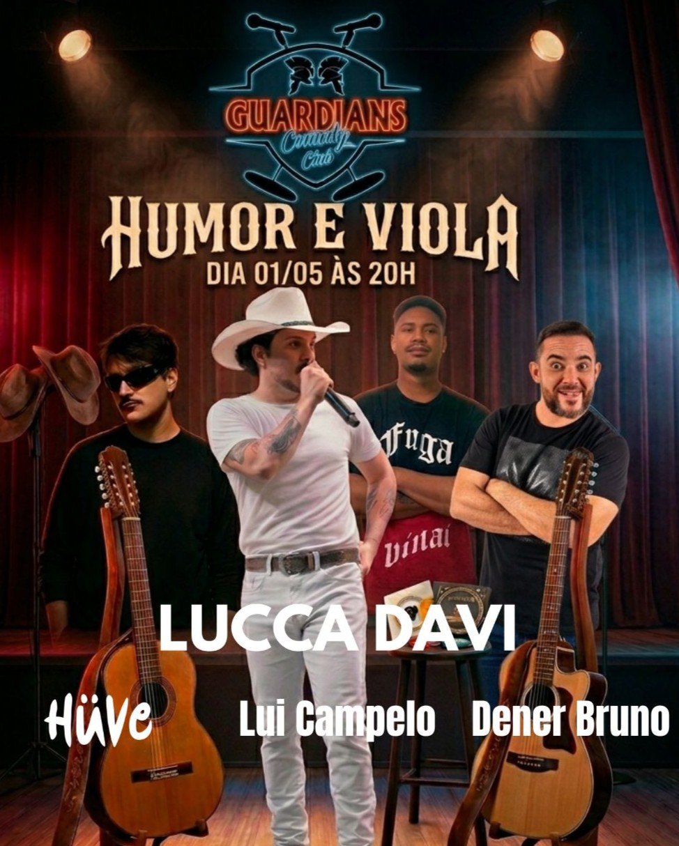 Prepare-se para uma noite única no Guardians Comedy Club, onde o riso encontra a música ao vivo em um espetáculo que mistura stand-up comedy com o melhor da viola! No dia 01 de maio, às 20h, o palco recebe Lucca Davi, trazendo seu talento e carisma em uma apresentação que une humor, música e interação com o público. Ao lado dele, Lui Campelo, Dener Bruno e Hüve completam o elenco com performances que transitam entre piadas afiadas, histórias do cotidiano e aquele toque especial da cultura brasileira. 🎶 Aqui, a viola não é só trilha sonora — ela faz parte da comédia. 😂 E o humor não é só piada — é experiência ao vivo, com energia de palco e conexão com a plateia. Se você gosta de dar risada e curte uma vibe musical diferente, esse show é pra você!