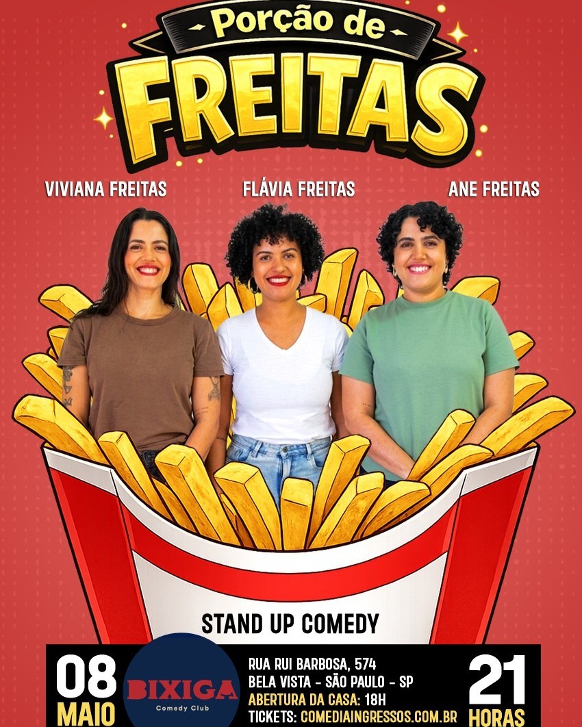 Três irmãs, três estilos e uma única missão: fazer você rir sem filtro. Viviana, Flávia e Ane Freitas trazem histórias afiadas sobre vida, família e caos cotidiano. Ane está na série “Pablo e Luizão” no Globoplay e Viviana em especial no Disney+. Um show leve, direto e muito engraçado.