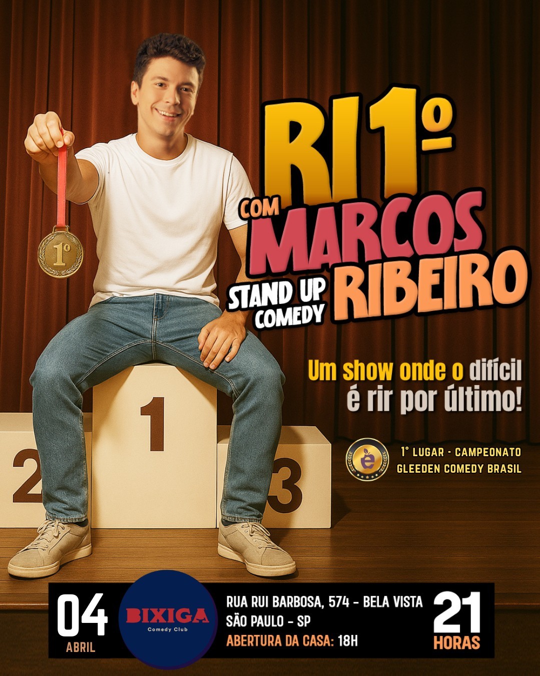 Prepare-se para uma noite de muitas risadas com o show "Ri Primeiro" com Marcos Ribeiro. Uma explosão de energia, improviso, imitações, caretas e humor corporal que vai fazer você rir ate cair da cadeira. Histórias direto do nosso Forrest Gump Brasileiro fazendo com que cada show seja único com um ritmo contagiante e gargalhadas garantidas. Vencedor do campeonato Gleeden Comedy Brasil de Stand up Comedy. Em uma hora de muitas risadas Marcos Ribeiro mostra a que veio e prova o por que subiu no topo do podium.