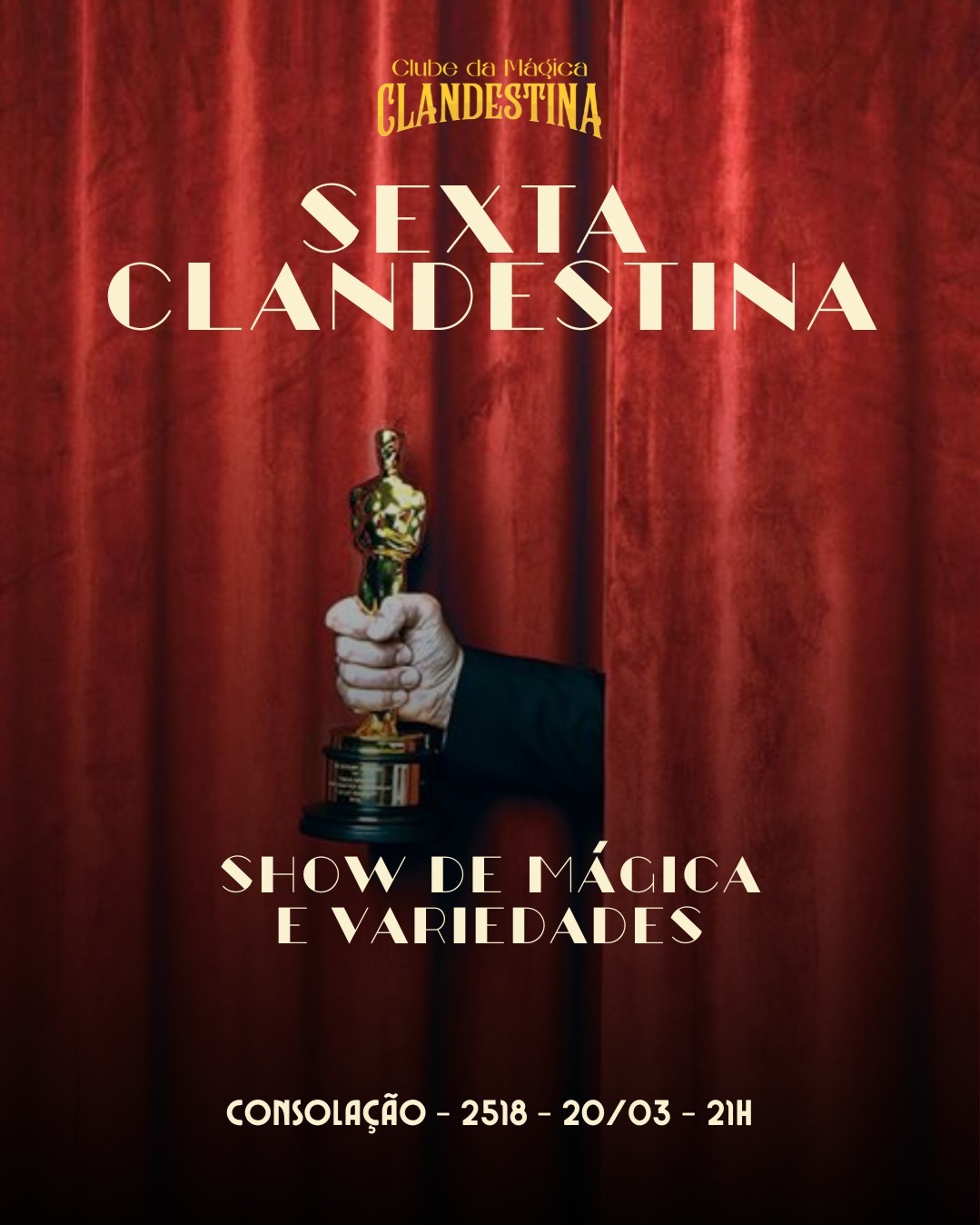 Venha viver uma noite diferente de verdade: Sexta Clandestina é um encontro clandestino no centro de São Paulo onde a mágica acontece bem perto, sem firula e sem distância, do jeito que dá pra sentir a coisa “pegando” na mesa, no olhar, na reação do público. A cada edição, você vê mágicos de todos os estilos na mesma noite: cartomagia, mentalismo, close-up, comédia, mistério… um elenco variado, ritmo rápido, e aquele clima de “não era pra eu estar vendo isso tão de perto”. É o rolê perfeito pra começar o fim de semana com uma experiência que foge do óbvio. 📍 Rua da Consolação, 2518 (pertinho do metrô) 🗓️ Sexta, 20/03 🕘 21h Entrada gratuita com contribuição espontânea!