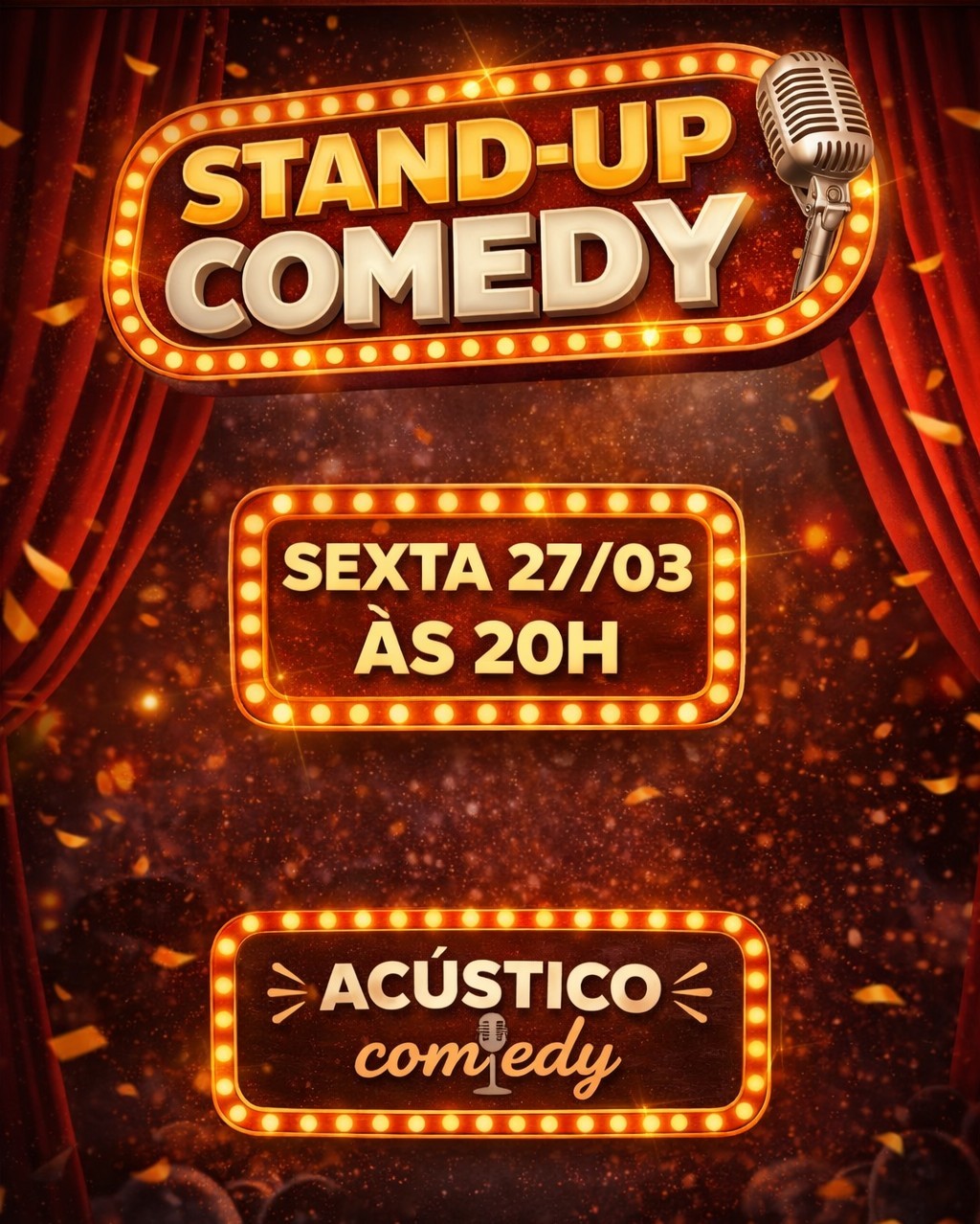 Sexta-feira é dia de dar aquela pausa na rotina e garantir boas risadas! 😂🎤 O Acústico Comedy prepara uma noite especial de stand-up comedy com elenco rotativo, reunindo comediantes que vão subir ao palco com estilos diferentes, histórias do cotidiano e piadas que vão te pegar de surpresa do começo ao fim. É o tipo de show perfeito pra ir com amigos, dar risada sem compromisso e descobrir novos talentos da comédia — tudo isso no clima intimista e aconchegante do Acústico.