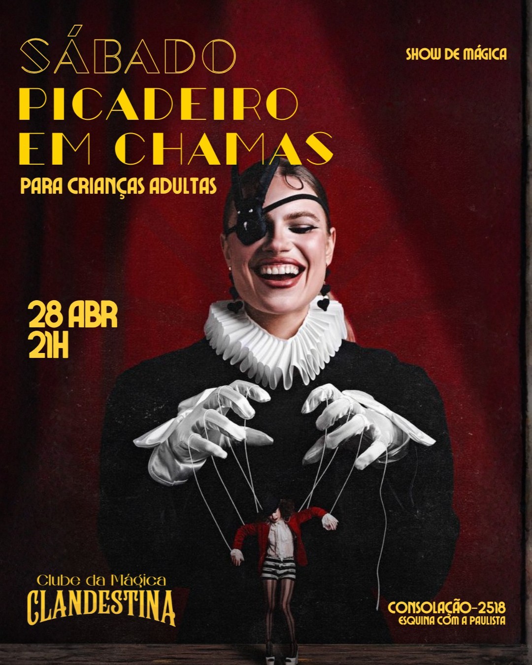 Picadeiro em Chamas – para crianças adultas é um convite para entrar num circo torto, noturno e encantado, onde o riso, o espanto e a loucura dividem o mesmo palco. Em clima burlesco, a noite celebra o Dia do Circo com mágica, palhaçaria e números que flertam com o caos, tudo bem perto do público. Uma experiência intensa, estranha e deliciosa, para quem ainda carrega dentro de si uma criança — só que já bastante corrompida pela vida. 📍 Rua da Consolação, 2518 (pertinho do metrô) 🗓️ Sábado, 28/03 🕘 21h