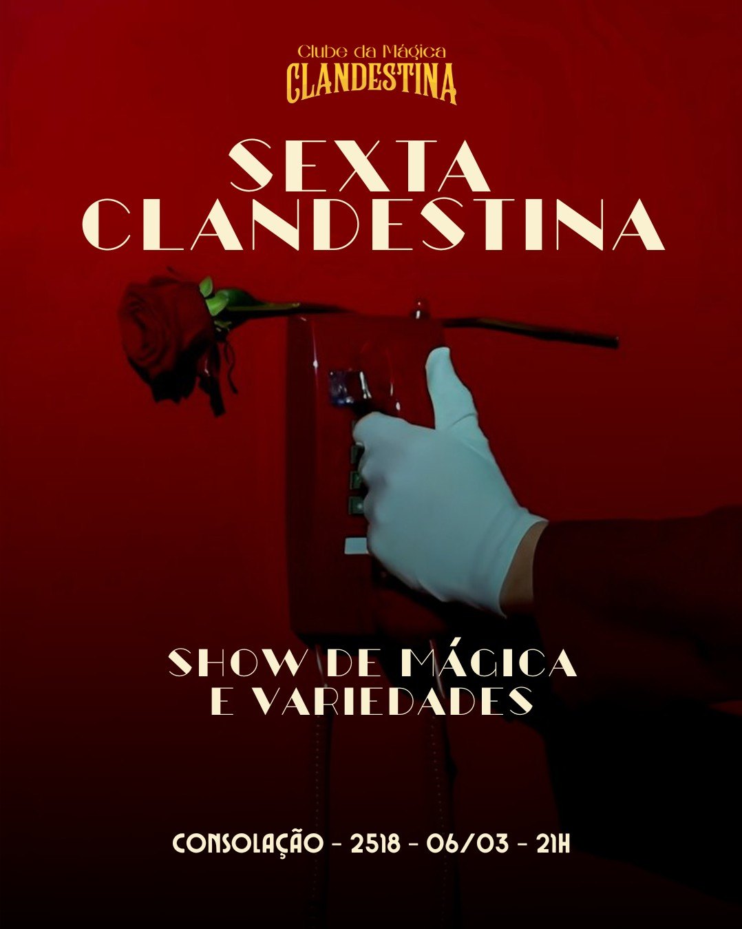 Venha viver uma noite diferente de verdade: Sexta Clandestina é um encontro clandestino no centro de São Paulo onde a mágica acontece bem perto, sem firula e sem distância, do jeito que dá pra sentir a coisa “pegando” na mesa, no olhar, na reação do público. A cada edição, você vê mágicos de todos os estilos na mesma noite: cartomagia, mentalismo, close-up, comédia, mistério… um elenco variado, ritmo rápido, e aquele clima de “não era pra eu estar vendo isso tão de perto”. É o rolê perfeito pra começar o fim de semana com uma experiência que foge do óbvio. 📍 Rua da Consolação, 2518 (pertinho do metrô) 🗓️ Sexta, 06/03 🕘 21h Entrada gratuita com contribuição espontânea!