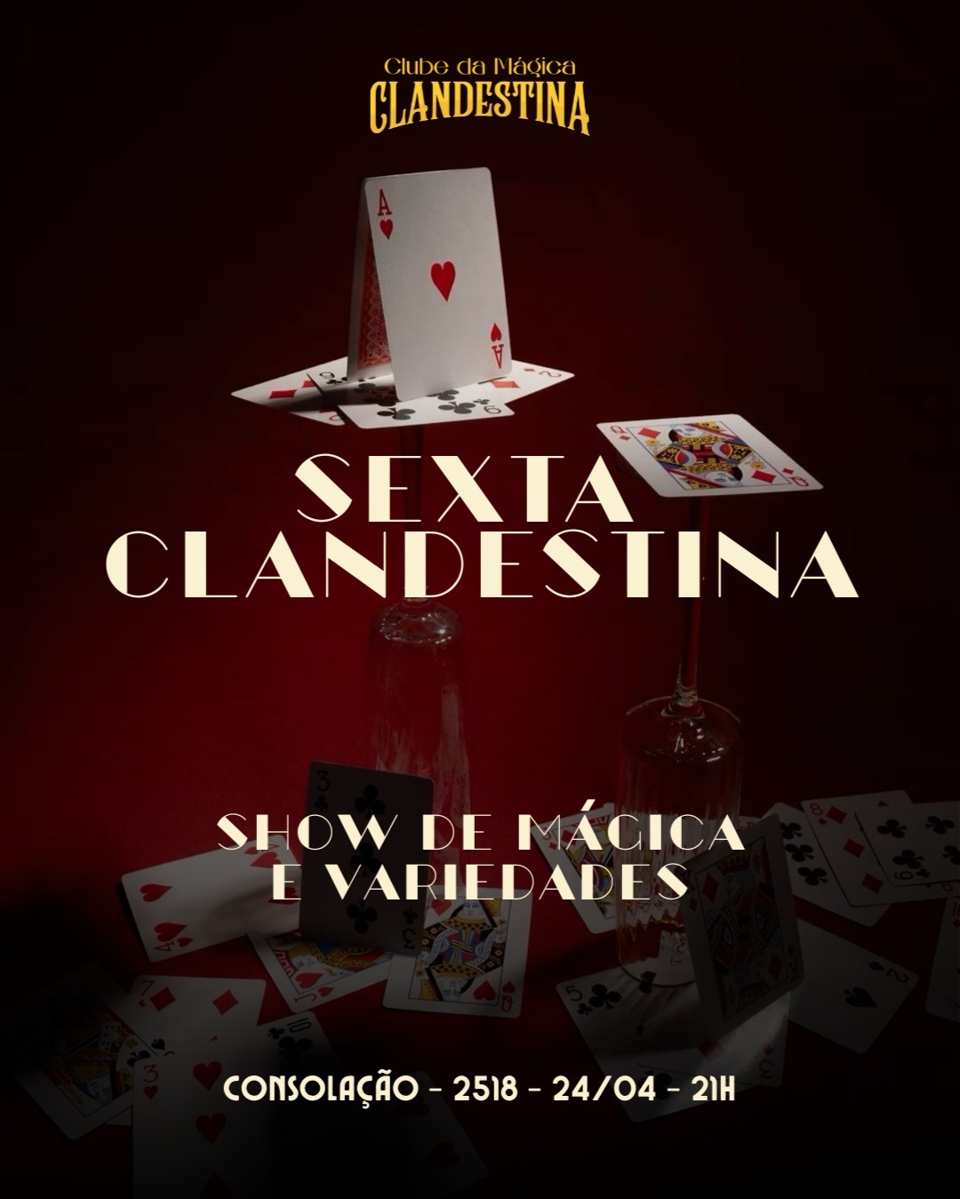 Vem viver uma sexta-feira diferente de tudo no mais novo rolê de entretenimento de São Paulo: SEXTA CLANDESTINA. Uma noite de mágica bem de perto, com vários artistas, estilos diferentes e surpresas que acontecem na sua frente. E nesta semana, a noite fica ainda mais especial: vamos receber mágicos internacionais, artistas que já viajaram o mundo levando sua arte para diferentes públicos e palcos. É daquelas edições raras, especiais mesmo, que você simplesmente não pode perder. 📍 Rua da Consolação, 2518 (pertinho do metrô) 🗓️ Sexta, 24/04 🕘 21h Entrada franca, com contribuição espontânea no final.
