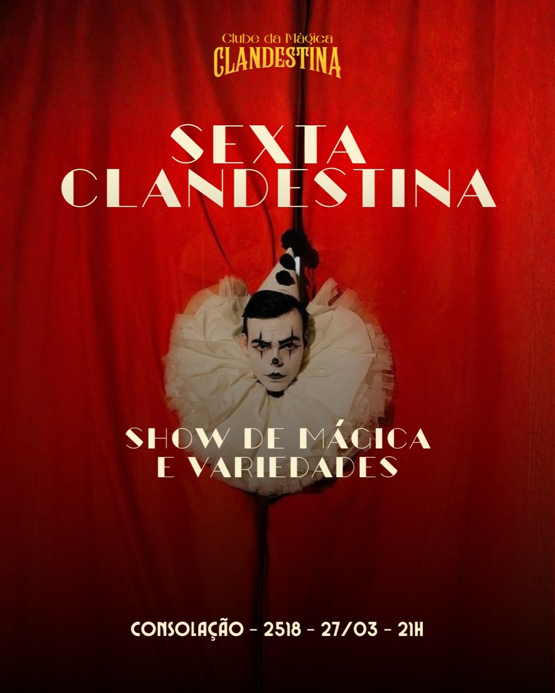 Venha viver uma noite diferente de verdade: Sexta Clandestina é um encontro de artistas no centro de São Paulo, onde a mágica acontece bem perto, sem firula e sem distância, do jeito que dá pra sentir a coisa “pegando” na mesa, no olhar, na ocorrência do público. A cada edição, você vê mágicos de todos os estilos na mesma noite: cartomagia, mentalismo, close-up, comédia, mistério… um elenco variado, ritmo rápido, e aquele clima de “não era pra eu estar vendo isso tão de perto”. É o rolê perfeito pra começar o fim de semana com uma experiência que foge do óbvio. 📍 Rua da Consolação, 2518 (pertinho do metrô) 🗓️ Sexta, 27/03 🕘 21h Entrada gratuita com contribuição espontânea!