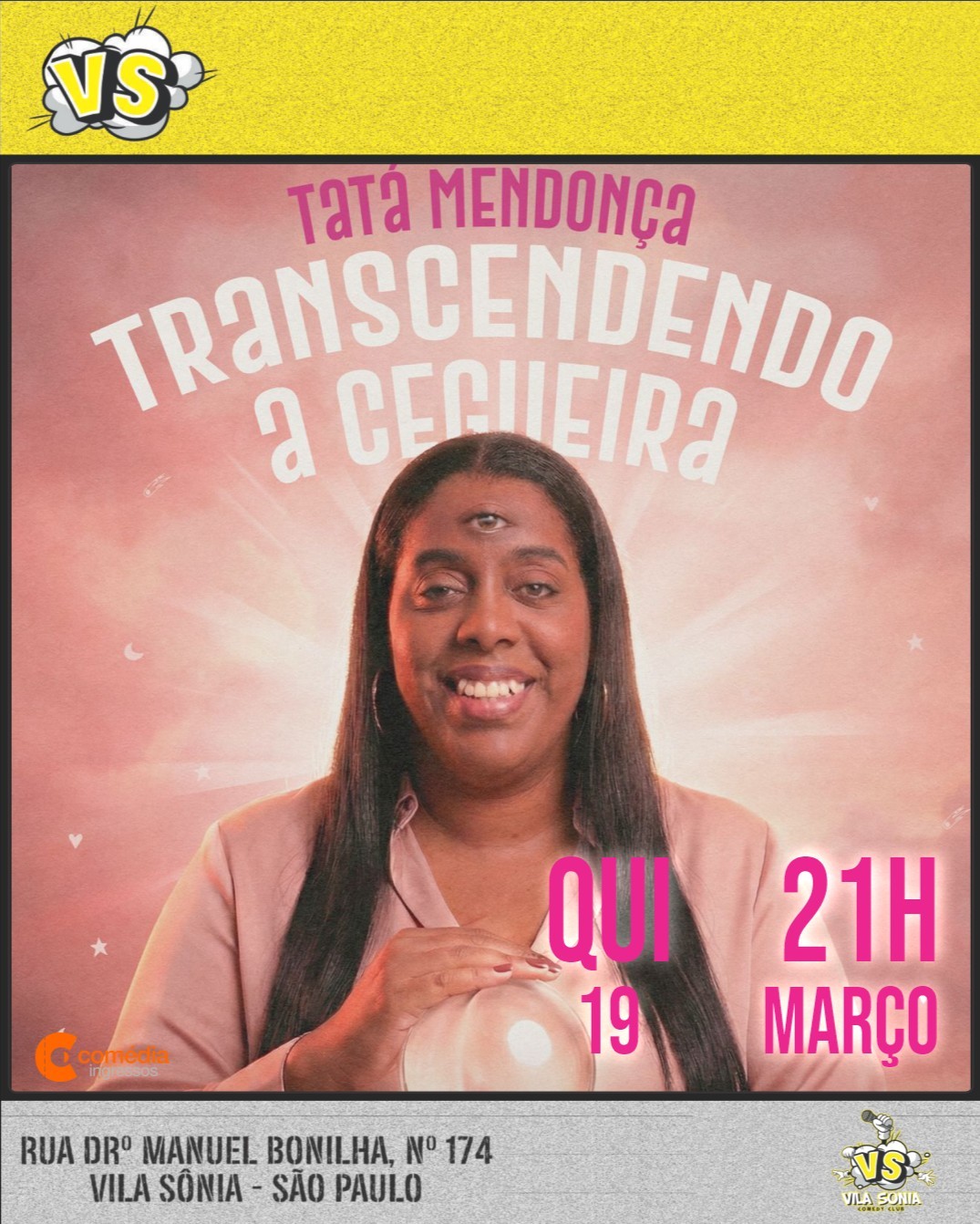 🎤 Tata Mendonça: "Transcendendo a Cegueira" A "Cega mais abusada do Brasil" chega ao Vila Sônia Comedy! Com mais de 5 milhões de seguidores e uma energia contagiante, Tata Mendonça traz seu show solo onde prova que a falta de visão é apenas um detalhe perto da sua percepção afiada sobre a vida. De forma leve, autodepreciativa e sem tabus, ela compartilha os perrengues, as gafes e as vitórias de uma mulher cega navegando em um mundo feito para quem enxerga. Prepare-se para rir de situações cotidianas sob uma perspectiva que você nunca viu (com o perdão do trocadilho). 📅 Informações do Show: Data: 19 de março Horário: 21h00 Local: Vila Sônia Comedy Club