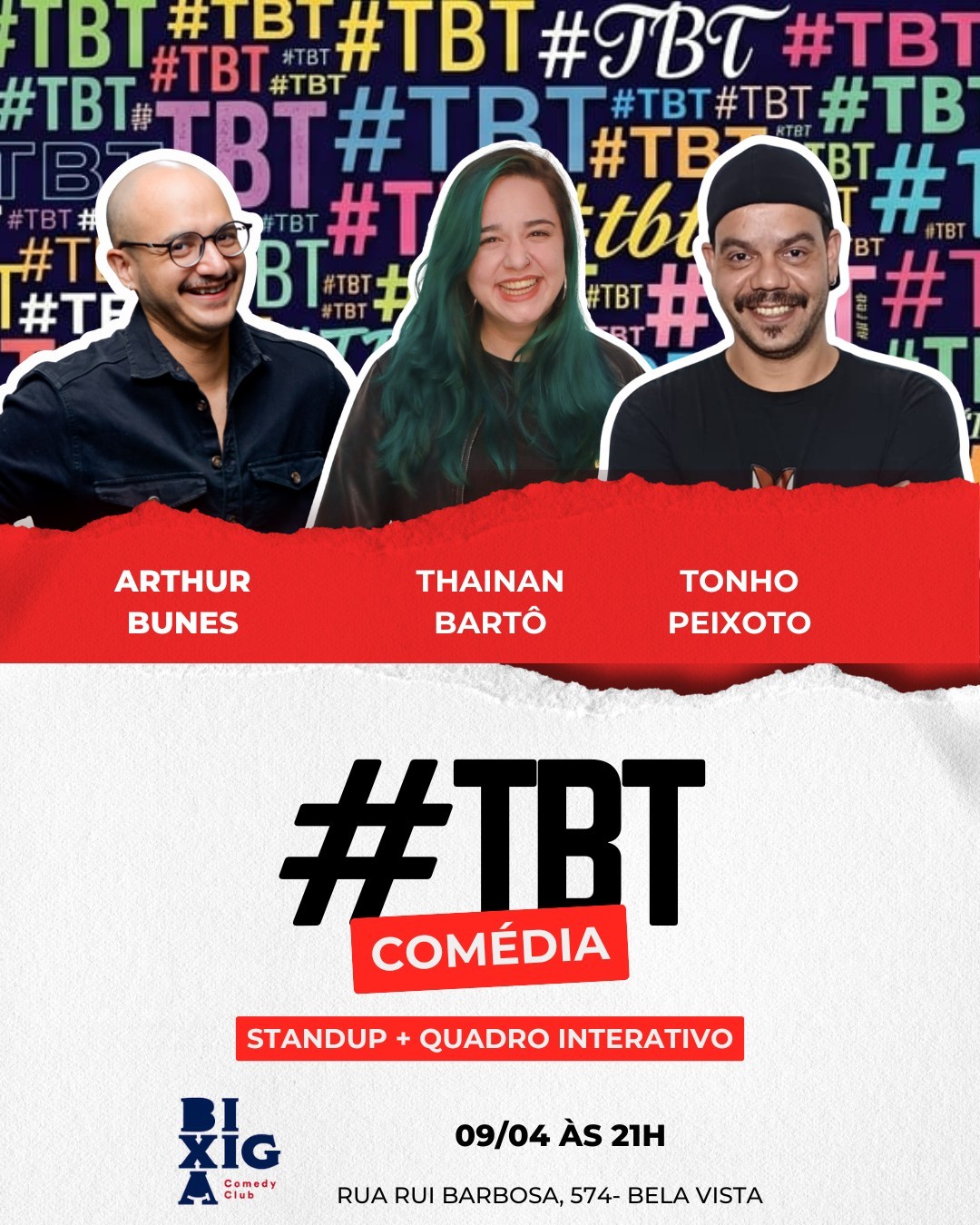 O #TBT Comédia é um show de comédia que mistura stand-up com quadro interativo. No palco, Arthur Bunes, Thainan Bartô e Tonho Peixoto vão além do stand-up tradicional, criando um formato dinâmico cheio de momentos únicos e improvisados.