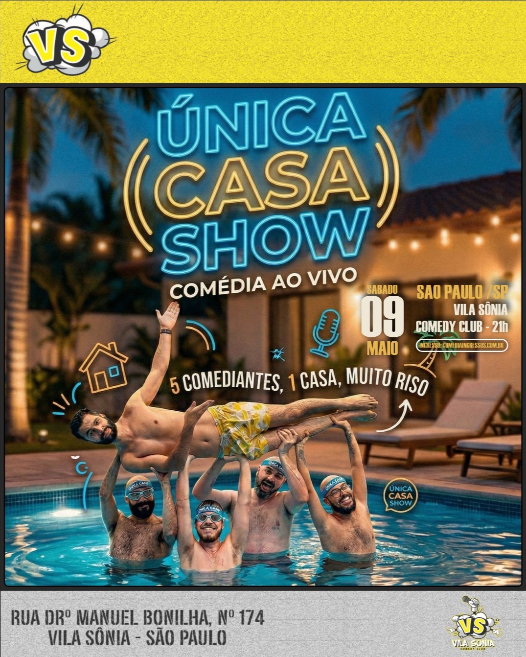 ÚNICA CASA – O Reality que a TV não mostrou Cinco comediantes, uma casa e histórias que deveriam ter ficado entre quatro paredes. "Da Única Casa" traz para o palco a rotina nada comum de quem vive de fazer rir. Esqueça as piadas prontas; aqui o roteiro é a vida real. Como é dividir o banheiro, as contas e os palcos com seus melhores amigos (e maiores rivais na hora de lavar a louça)? Venha descobrir os bastidores da convivência mais engraçada de São Paulo em um show que prova que, no final das contas, tudo vira piada.