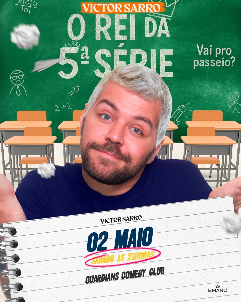 Victor Sarro apresenta “O Rei da 5ª Série” no Guardians Comedy Club Prepare-se para voltar direto para a sala de aula — mas daquela forma que a professora jamais aprovaria. O humorista Victor Sarro chega ao Guardians Comedy Club com o espetáculo “O Rei da 5ª Série”, um show de stand-up que celebra o humor mais debochado, espontâneo e sem filtro. Conhecido por sua rapidez de raciocínio e forte interação com a plateia, Sarro transforma situações do cotidiano em piadas afiadas, explorando aquele lado que todo adulto tenta esconder: a eterna 5ª série que vive dentro de nós. É o tipo de show em que a gargalhada vem antes mesmo de você perceber que está rindo da própria imaturidade. Com histórias pessoais, improvisos e observações certeiras sobre comportamento, relacionamentos e situações constrangedoras, “O Rei da 5ª Série” é uma experiência para quem gosta de humor direto, inteligente e cheio de energia. Se você já riu no momento errado, fez piada na hora imprópria ou nunca superou o espírito da quinta série… esse show é pra você.